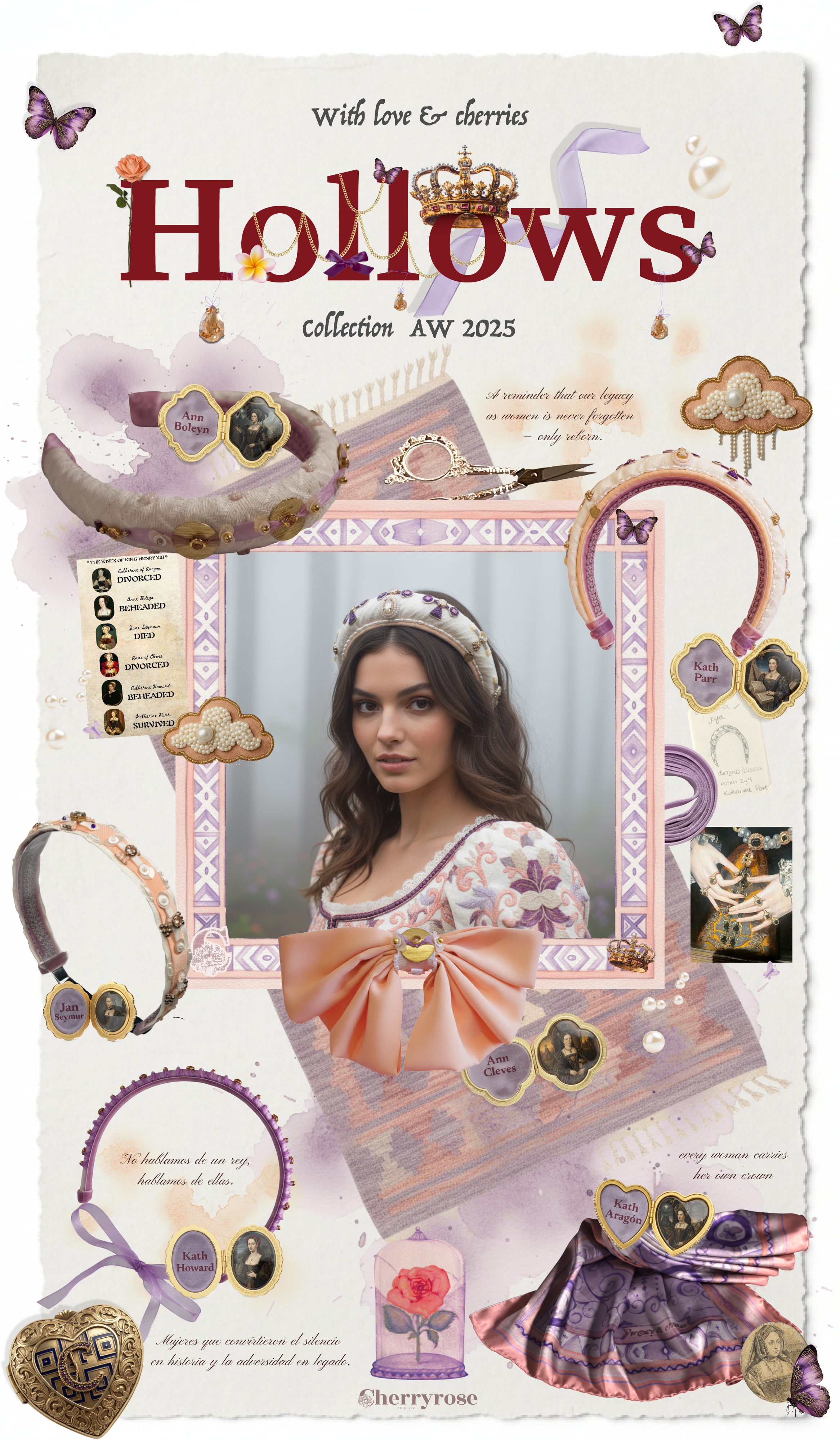 Inspirada en las mujeres que marcaron el curso de una época, Hollows Collection no mira hacia el trono, sino hacia las que lo enfrentaron. En un mundo gobernado por el poder de un solo hombre, ellas fueron la voz silenciada que aún resuena. Cada pieza encarna su dualidad "La fragilidad y la fuerza, la belleza y el desafío, la luz que nace desde la sombra." No fueron solo las esposas de un rey, fueron las primeras musas de su propia libertad.